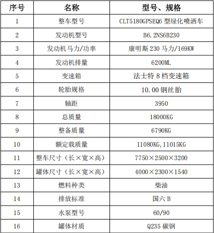 1、整車型號: CLT5180GPSEQ6型綠化噴灑車